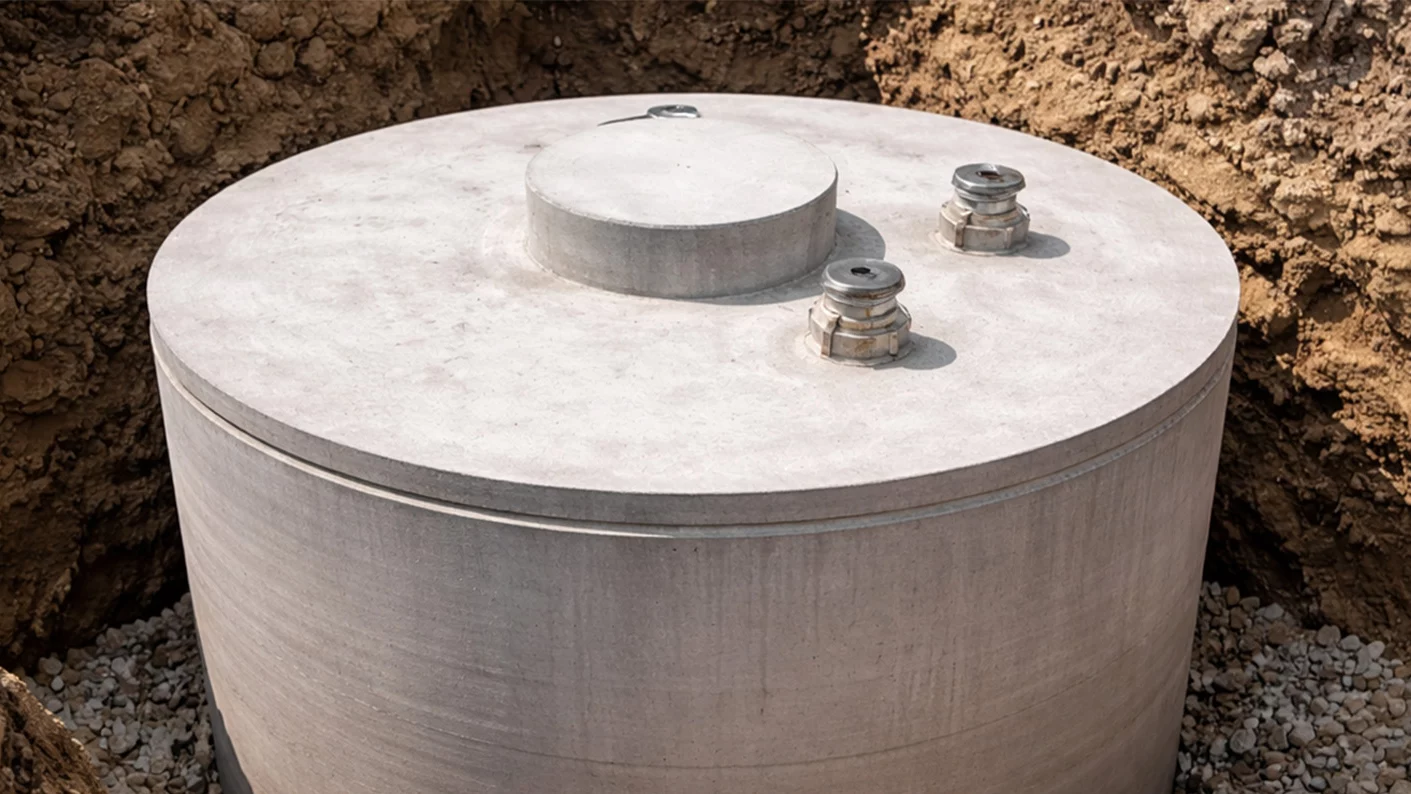 Ein im Erdreich versenkter Betonbehälter, gefüllt mit Wasser. Dort wird das Wasser kontinuierlich gefroren und wieder aufgetaut. Die Zisterne dient als thermischer Langzeitspeicher.