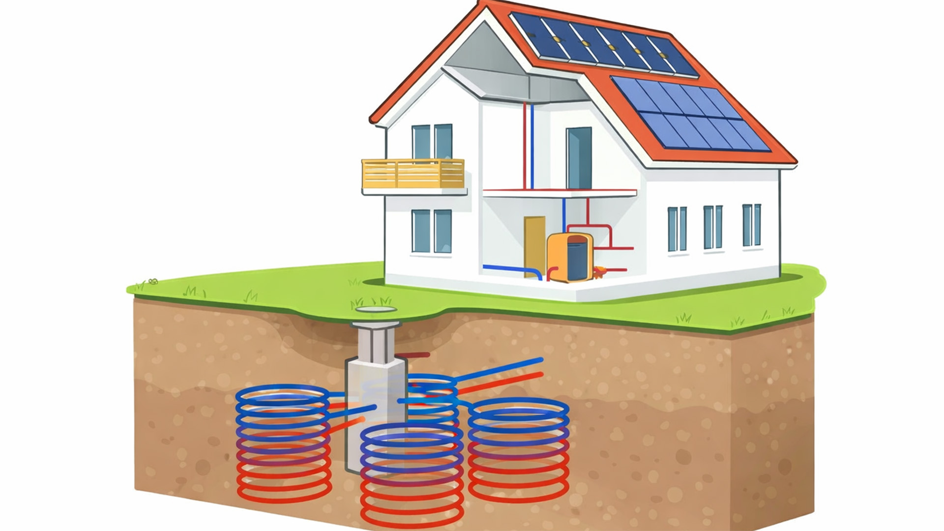 Durch Erdsonden nutzen wir die konstante Temperatur des Erdreichs (ca. 10-12 °C). Im Winter entzieht die Wärmepumpe dem Boden Wärme zum Heizen, im Sommer kann das System zur passiven Kühlung („Natural Cooling“) genutzt werden, was den Energiebedarf für Klimatisierung deutlich reduziert.
