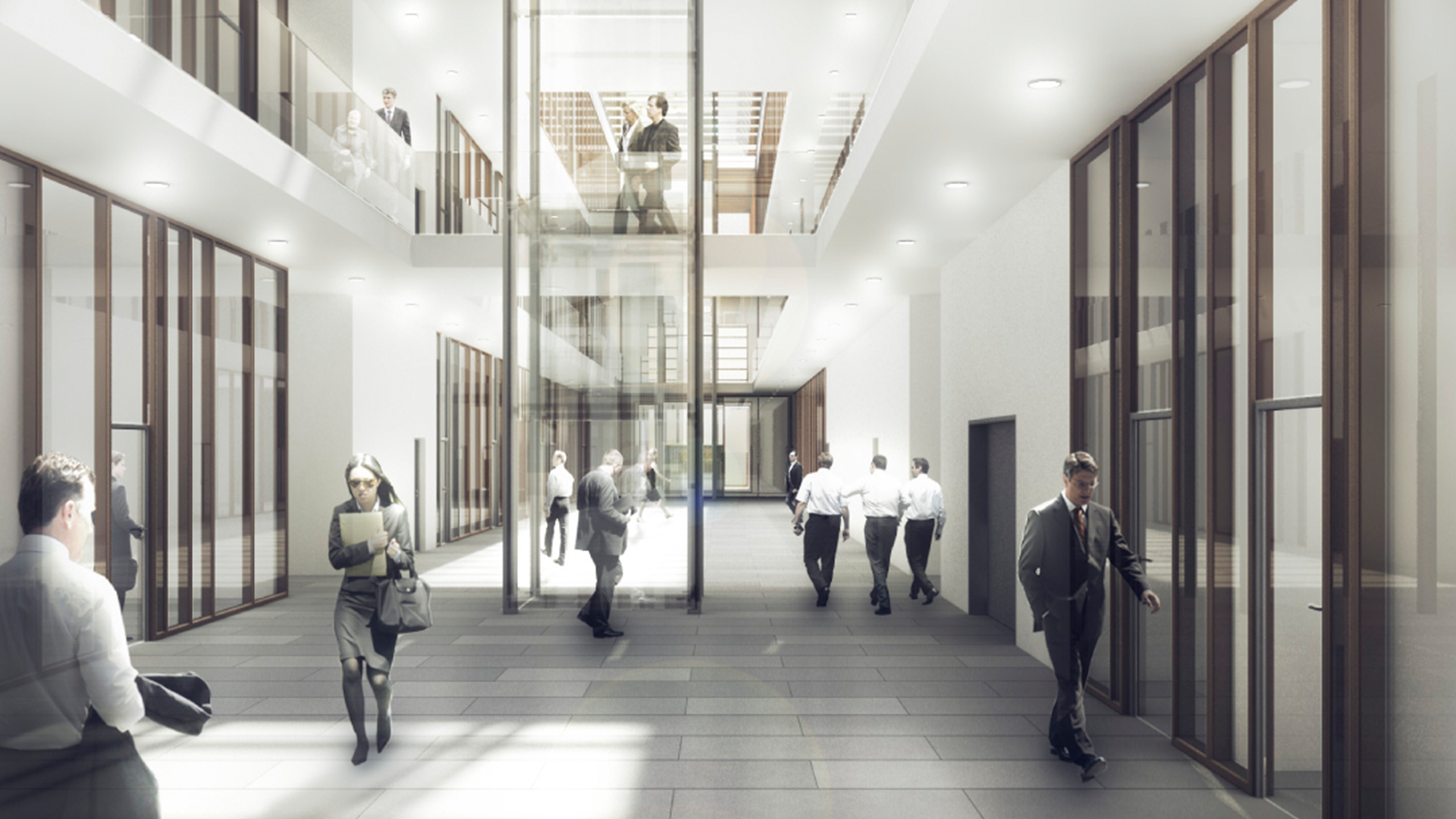 Dem Prinzip eines Einkaufszentrums folgend, können die Kunden im neuen Mercedes-Haus alle Bereiche auf kurzen, trockenen Wegen erreichen. Die Kundenparkplätze und der Haupteingang liegen in einem zentralen Innenhof, der den Schauraum mit Dialogannahme, Werkstatt und Lager verbindet. Architektonische Raffinesse ist eine schwebende Dachscheibe, die den gesamten Innenhof und Teile der Außenbereiche auf einer Höhe von 10 Metern überspannt und einen fließenden Übergang zwischen Außen- und Innenraum schafft.