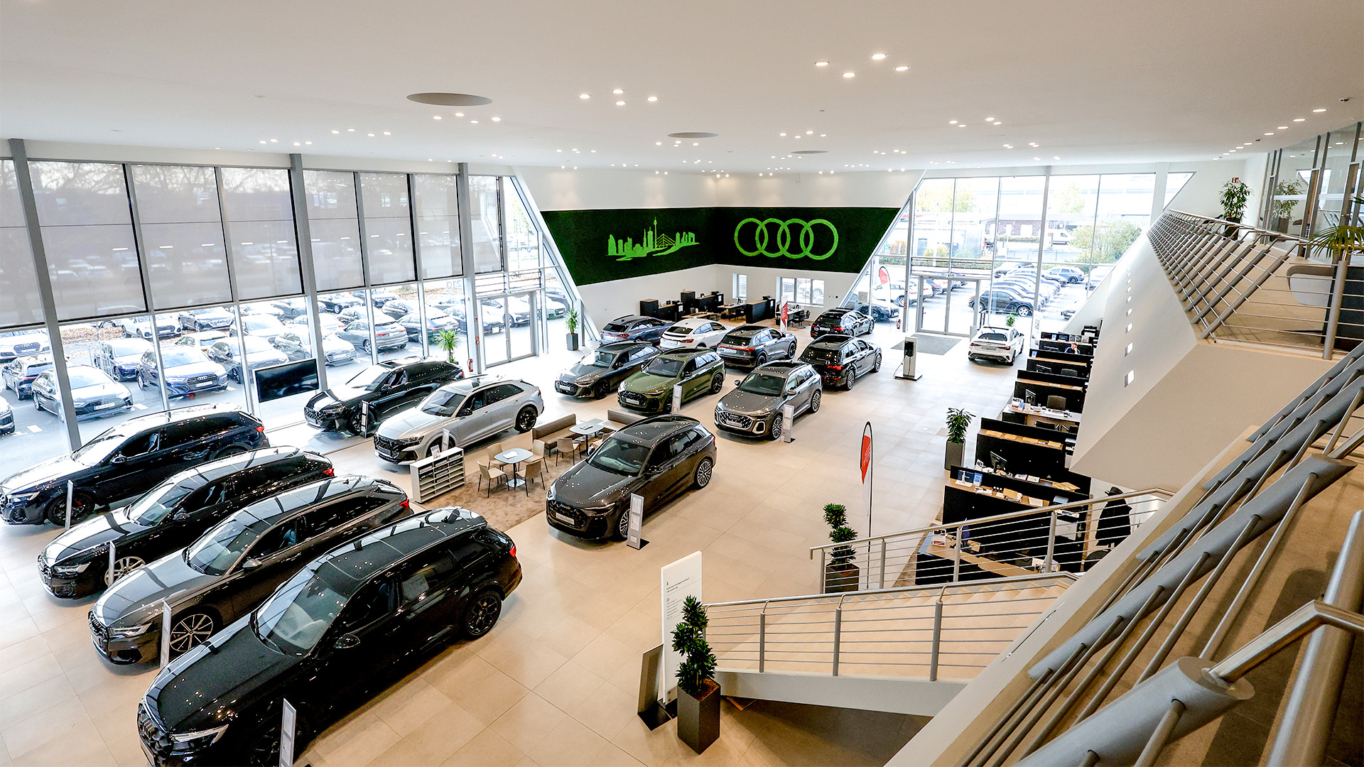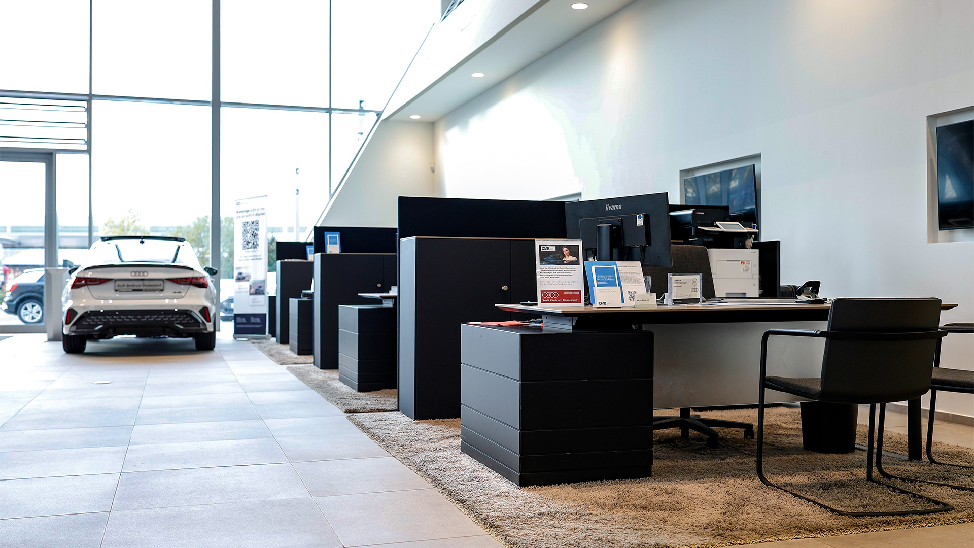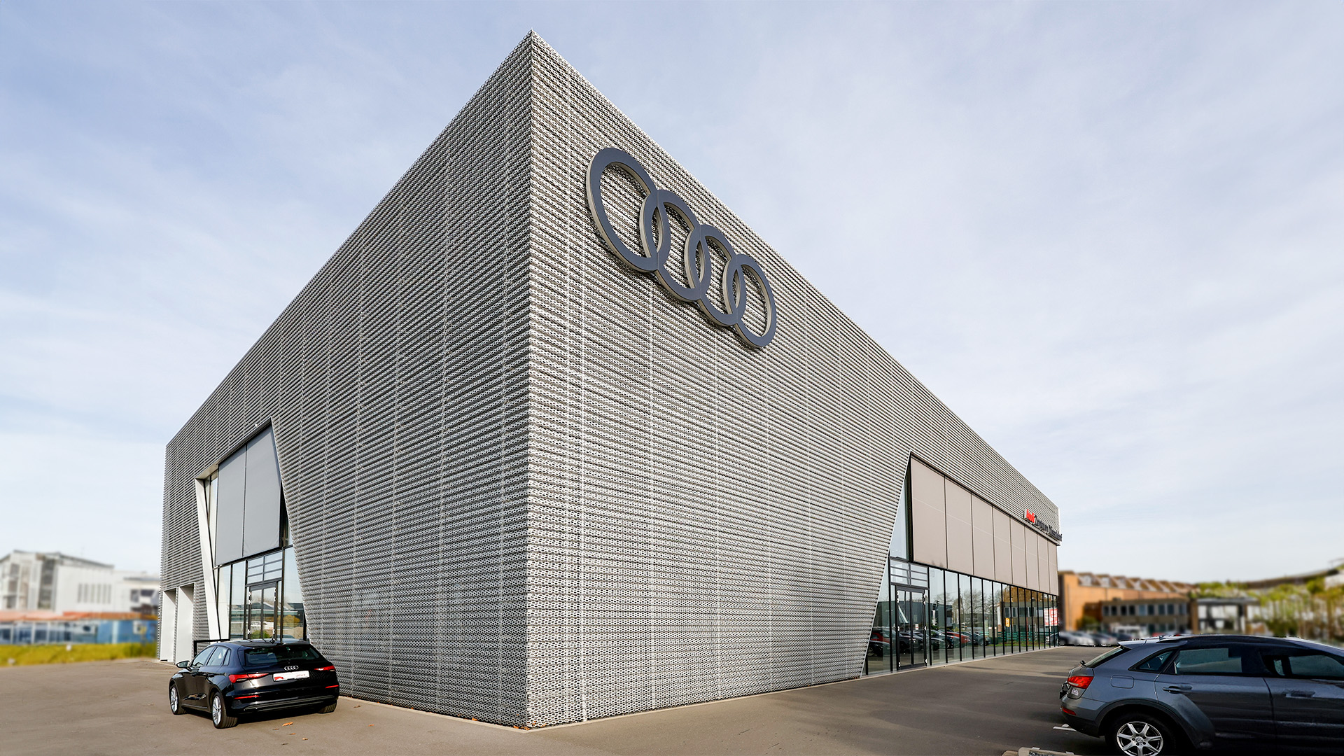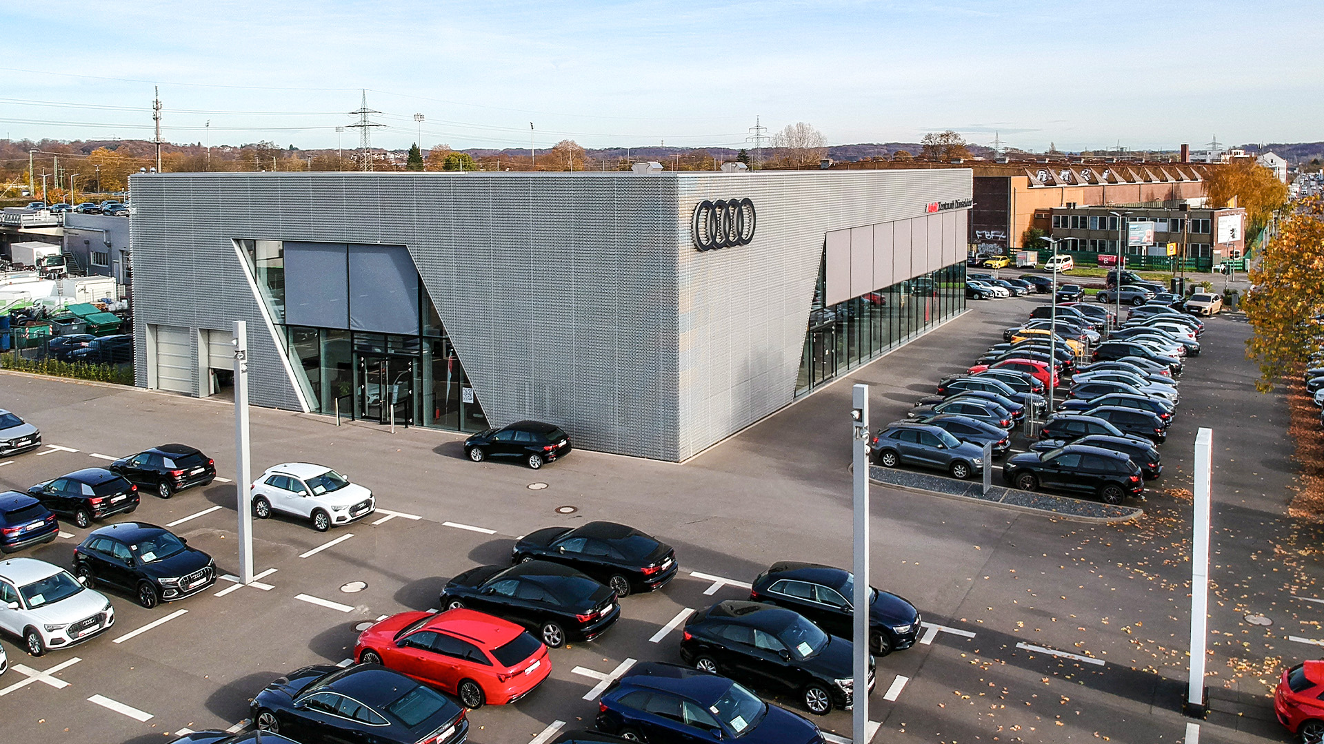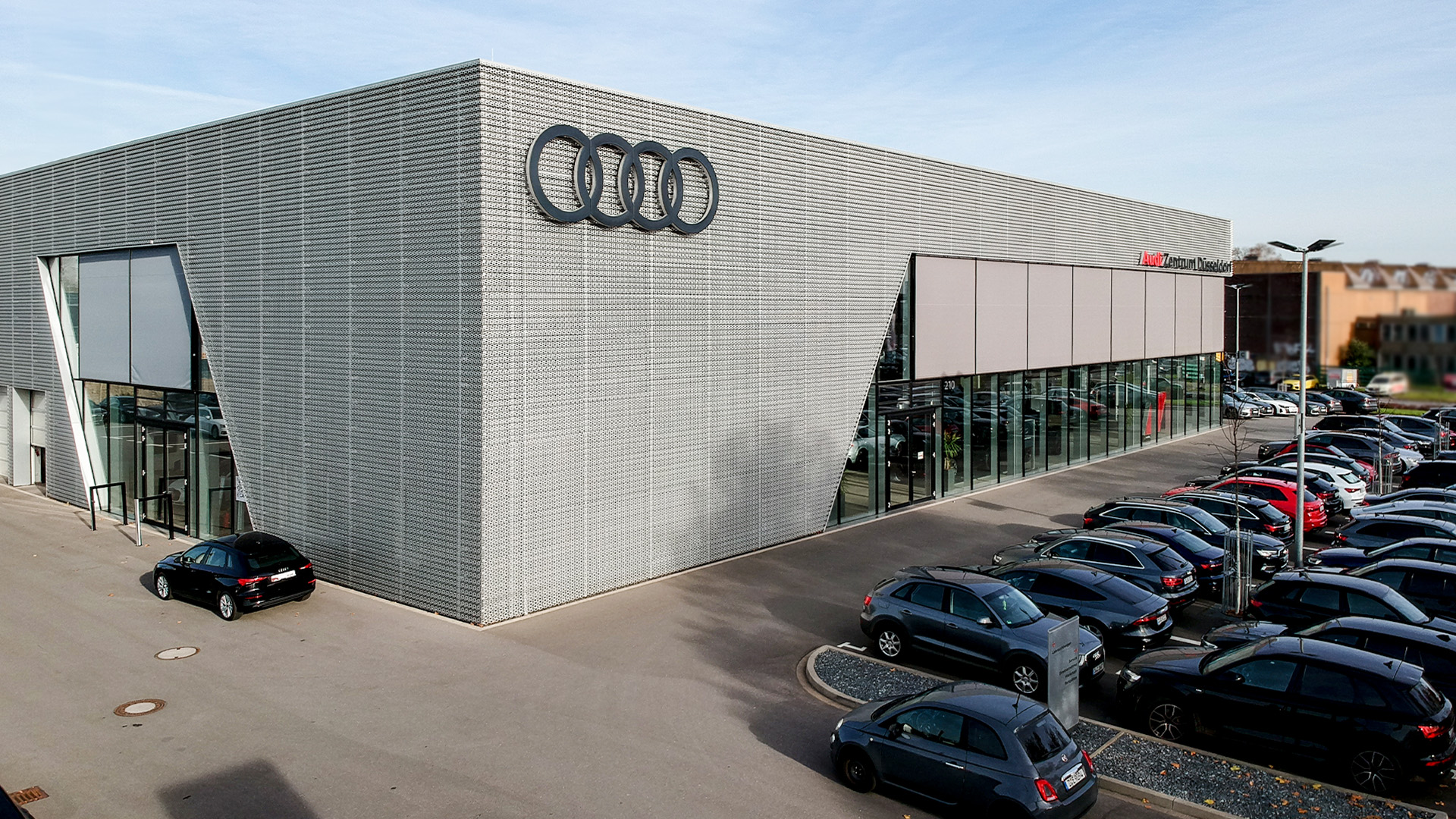 Für das Audi Zentrum Düsseldorf wurde ein 10 Meter hoher Kubus mit einem Galeriegeschoss als freitragende Stahlkonstruktion konzipiert. In die silberfarbene gekantete Aluminium-Lochblechfassade sind schräg angeschnittene Glasflächen eingelassen, die wie überdimensionale Schaufenster den Blick auf den weiten, stützenfreien Ausstellungsraum freigeben. Auf etwa 2.300 Quadratmetern werden hier Neu- und Gebrauchtfahrzeuge präsentiert. Der Showroom wird durch virtuelle Beratungssuiten ergänzt, in denen die Kunden Fahrzeuge digital und interaktiv erleben können.