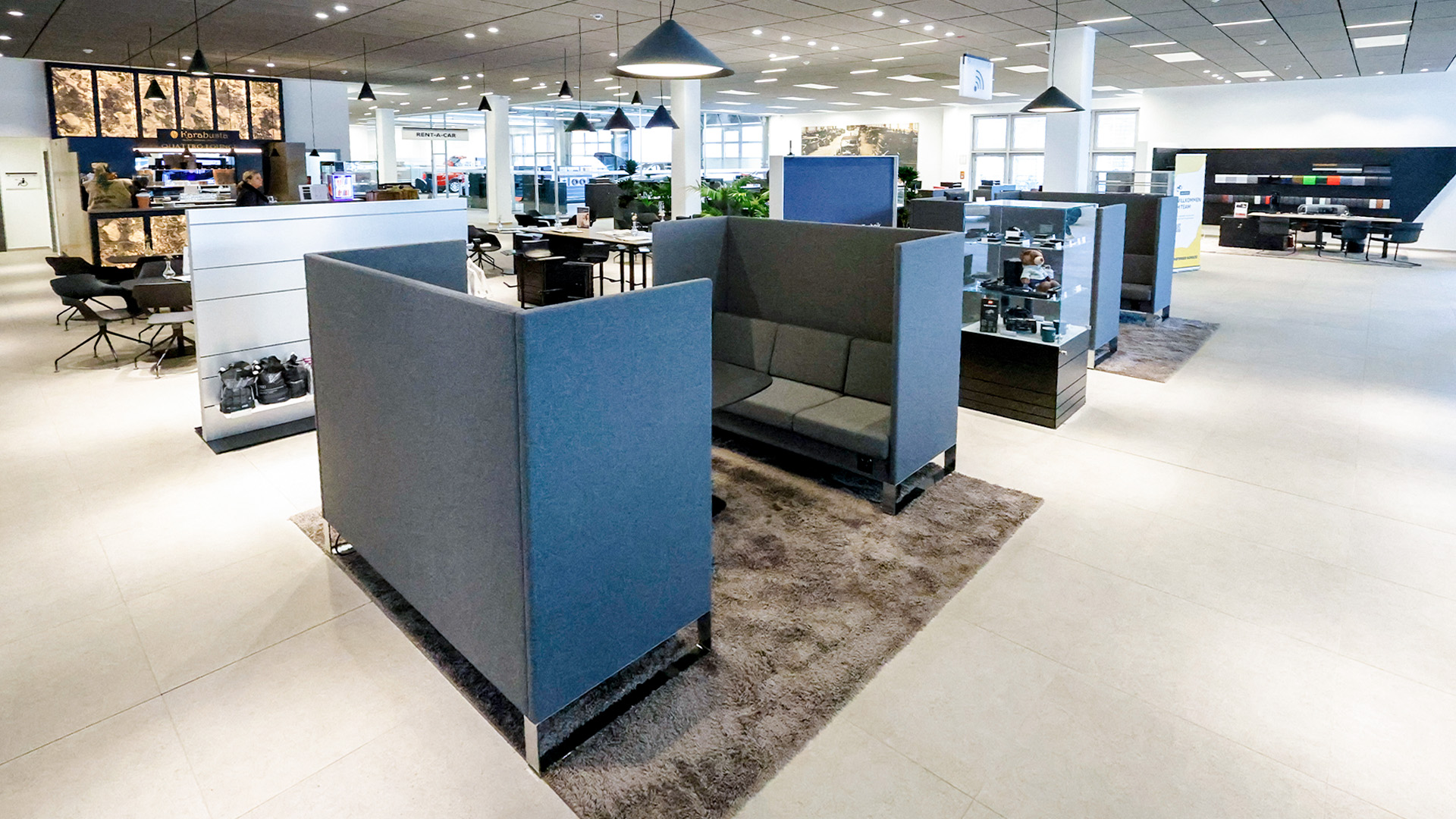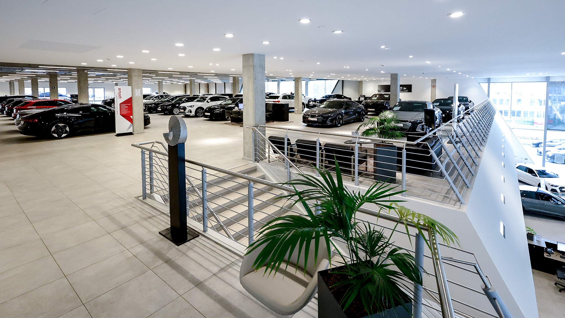 Unterhalb der Galerie liegt die Kundenzone mit dem Verkaufsbereich und der Fahrzeugübergabe. Eine weit ausladende Treppe führt auf die Galerieebene, auf der sich Büroräume befinden sowie weitere Flächen für die Präsentation hochwertiger Gebrauchtfahrzeuge. Im rückwärtigen Gebäudeteil befindet sich die rund 2.000 Quadratmeter große Werkstatt und das Teilelager. Auf der Freifläche des 19.000 Quadratmeter großen Grundstücks sowie auf Teilen des Werkstattdaches ist viel Platz für die Gebrauchtwagenausstellung und die Kundenparkplätze.