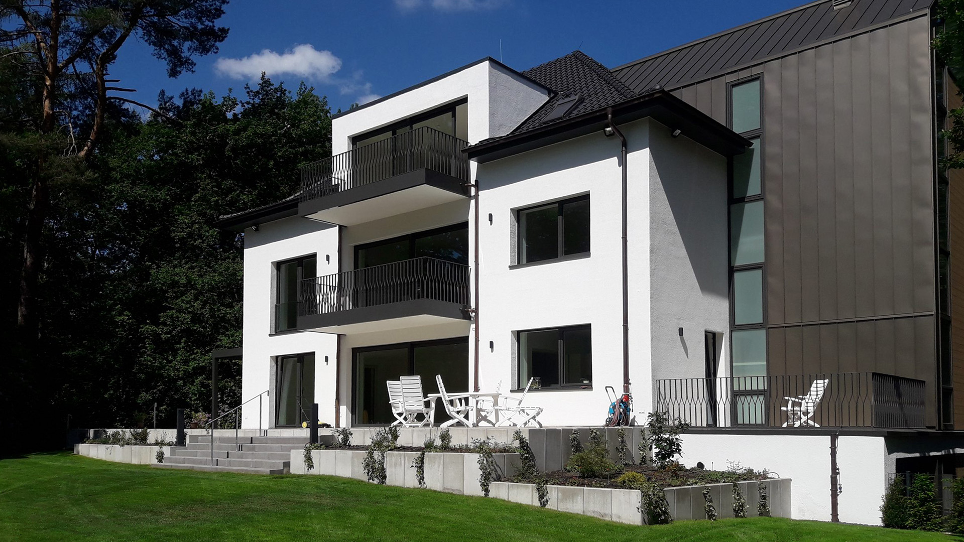 Das dreigeschossige Einfamilienhaus ist inspiriert vom Bauhausstil und folgt dem Wunsch der Bauherren nach Privatsphäre und Offenheit zugleich. Zur Straße präsentiert sich das Gebäude abgeschirmt mit einem zurückhaltenden Eingangsbereich, der den privaten Charakter unterstreicht. Zum weitläufigen Garten hin öffnet sich das Haus terrassenartig. Bodentiefe Glasflächen schaffen Offenheit und eine Verbindung von Wohnraum und Natur.