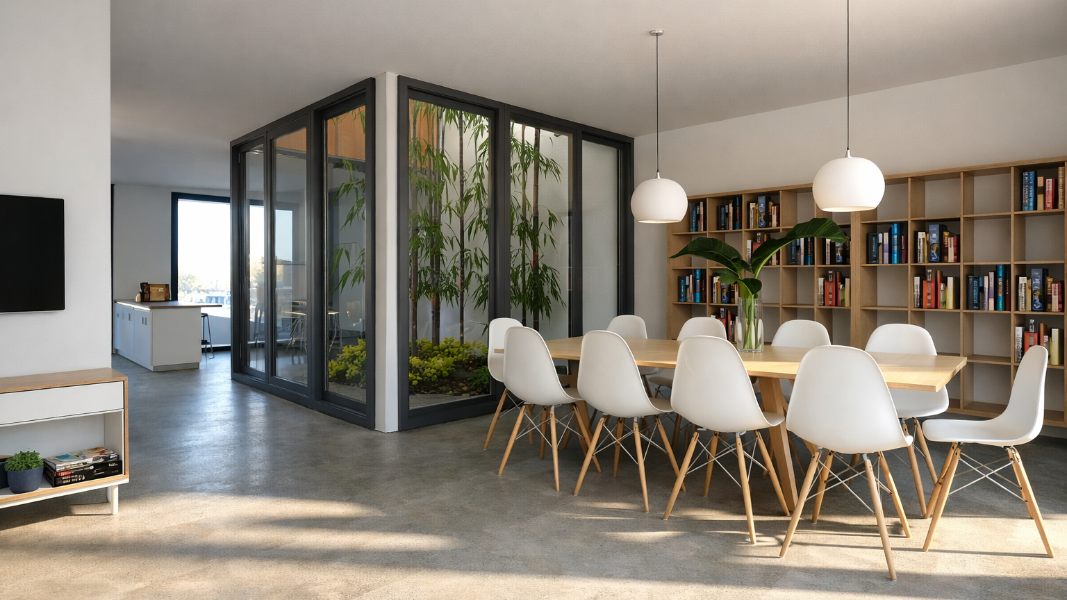 Der lichtdurchflutete Wohn-Ess-Bereich im Erdgeschoss ist in warmen Holztönen gehalten. Ein Bodenfenster gibt den Blick in die Garage frei, in der außergewöhnliche Automobile aus der Sammlung des Bauherrn präsentiert werden. Das Glas kann von transparent auf blickdicht umgeschaltet werden und bietet so Flexibilität zwischen Offenheit und Diskretion. Die zur Gartenseite verglaste Garage inszeniert die Fahrzeuge als architektonisches Highlight und verbindet Funktion mit Leidenschaft.
